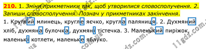 1. Зміни прикметники так, щоб утворилися словосполучення. 2. Запиши словосполучення. Познач у прикметниках закінчення. 1. Круглий млинець, кругле яєчко, кругла паляниця. 2. Духмяний хліб, духмяна булочка, духмяні тістечка. 3. Маленький пиріжок, маленькі котлети, маленьке яблуко.