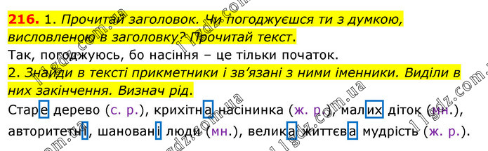 1. Прочитай заголовок. Чи погоджуєшся ти з думкою, висловленою в заголовку? Прочитай текст. Так, погоджуюсь, бо насіння – це тільки початок. 2. Знайди в тексті прикметники і зв’язані з ними іменники. Виділи в них закінчення. Визнач рід. Старе дерево (с. р.), крихітна насінинка (ж. р.), малих діток (мн.), авторитетні, шановані люди (мн.), велика життєва мудрість (ж. р.).