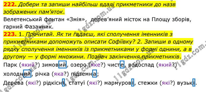 222. Добери та запиши найбільш вдалі прикметники до назв зображених пам’яток. Велетенський фонтан «Змія», дерев’яний місток на Площу зборів, гарний Фазанник. 223. 1. Прочитай. Як ти гадаєш, які сполучення іменників з прикметниками допоможуть описати Софіївку? 2. Запиши в одному рядку сполучення іменників із прикметниками у формі однини, а в другому — у формі множини. Познач закінчення прикметників. Парк (який?) зимовий, озеро (яке?) чисте, водоспад (який?) холодний, річка (яка?) підземна; Дерева (які?) рідкісні, статуї (які?) мармурові, стежки (які?) вузькі.