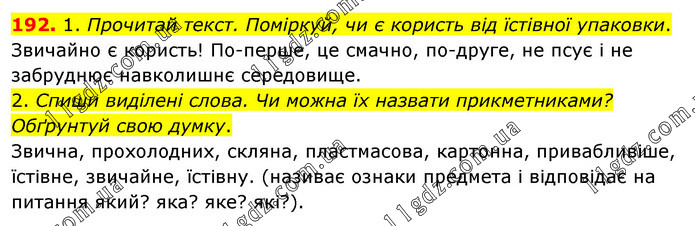 1. Прочитай текст. Поміркуй, чи є користь від їстівної упаковки. Звичайно є користь! По-перше, це смачно, по-друге, не псує і не забруднює навколишнє середовище. 2. Спиши виділені слова. Чи можна їх назвати прикметниками? Обґрунтуй свою думку. Звична, прохолодних, скляна, пластмасова, картонна, привабливіше, їстівне, звичайне, їстівну. (називає ознаки предмета і відповідає на питання який? яка? яке? які?).