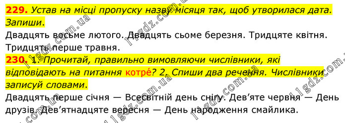 229. Устав на місці пропуску назву місяця так, щоб утворилася дата. Запиши. Двадцять восьме лютого. Двадцять сьоме березня. Тридцяте квітня. Тридцять перше травня. 230. 1. Прочитай, правильно вимовляючи числівники, які відповідають на питання котре́? 2. Спиши два речення. Числівники записуй словами. Двадцять перше січня — Всесвітній день снігу. Дев’яте червня — День друзів. Дев’ятнадцяте вересня — День народження смайлика.