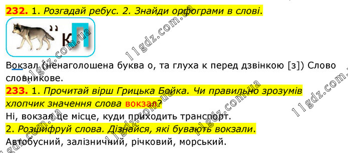 232. 1. Розгадай ребус. 2. Знайди орфограми в слові. Вокзал (ненаголошена буква о, та глуха к перед дзвінкою [з]) Слово словникове. 233. 1. Прочитай вірш Грицька Бойка. Чи правильно зрозумів хлопчик значення слова вокзал? Ні, вокзал це місце, куди приходить транспорт. 2. Розшифруй слова. Дізнайся, які бувають вокзали. Автобусний, залізничний, річковий, морський.