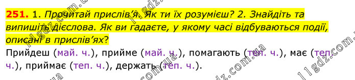1. Прочитай прислів’я. Як ти їх розумієш? 2. Знайдіть та випишіть дієслова. Як ви гадаєте, у якому часі відбуваються події, описані в прислів’ях? Прийдеш (май. ч.), прийме (май. ч.), помагають (теп. ч.), має (теп. ч.), приймає (теп. ч.), держать (теп. ч.).