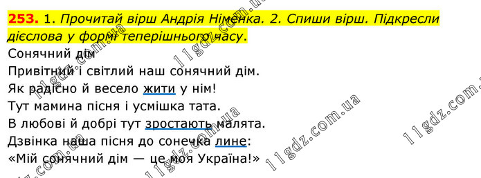 1. Прочитай вірш Андрія Німенка. 2. Спиши вірш. Підкресли дієслова у формі теперішнього часу. Сонячний дім Привітний і світлий наш сонячний дім. Як радісно й весело жити у нім! Тут мамина пісня і усмішка тата. В любові й добрі тут зростають малята. Дзвінка наша пісня до сонечка лине: «Мій сонячний дім — це моя Україна!»