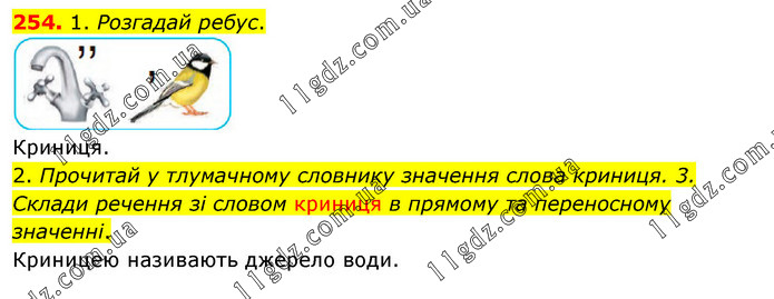 1. Розгадай ребус. Криниця. 2. Прочитай у тлумачному словнику значення слова криниця. 3. Склади речення зі словом криниця в прямому та переносному значенні. Криницею називають джерело води.