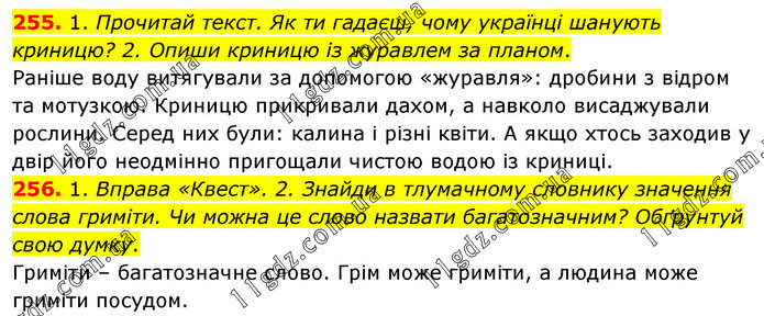 255. 1. Прочитай текст. Як ти гадаєш, чому українці шанують криницю? 2. Опиши криницю із журавлем за планом. Раніше воду витягували за допомогою «журавля»: дробини з відром та мотузкою. Криницю прикривали дахом, а навколо висаджували рослини. Серед них були: калина і різні квіти. А якщо хтось заходив у двір його неодмінно пригощали чистою водою із криниці. 256. 1. Вправа «Квест». 2. Знайди в тлумачному словнику значення слова гриміти. Чи можна це слово назвати багатозначним? Обґрунтуй свою думку. Гриміти – багатозначне слово. Грім може гриміти, а людина може гриміти посудом.