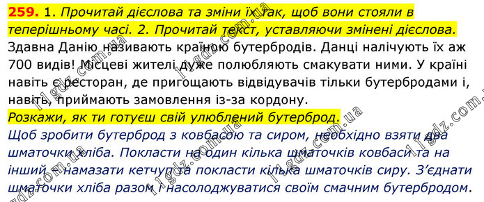 1. Прочитай дієслова та зміни їх так, щоб вони стояли в теперішньому часі. 2. Прочитай текст, уставляючи змінені дієслова. Здавна Данію називають країною бутербродів. Данці налічують їх аж 700 видів! Місцеві жителі дуже полюбляють смакувати ними. У країні навіть є ресторан, де пригощають відвідувачів тільки бутербродами і, навіть, приймають замовлення із-за кордону. Розкажи, як ти готуєш свій улюблений бутерброд. Щоб зробити бутерброд з ковбасою та сиром, необхідно взяти два шматочки хліба. Покласти на один кілька шматочків ковбаси та на інший – намазати кетчуп та покласти кілька шматочків сиру. З’єднати шматочки хліба разом і насолоджуватися своїм смачним бутербродом.