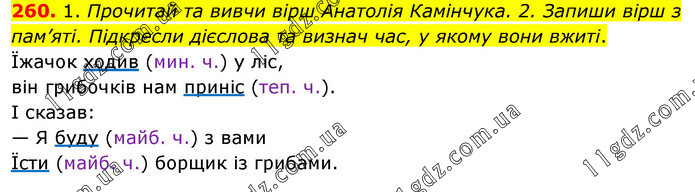 1. Прочитай та вивчи вірш Анатолія Камінчука. 2. Запиши вірш з пам’яті. Підкресли дієслова та визнач час, у якому вони вжиті. Їжачок ходив (мин. ч.) у ліс, він грибочків нам приніс (теп. ч.). І сказав: — Я буду (майб. ч.) з вами Їсти (майб. ч.) борщик із грибами.
