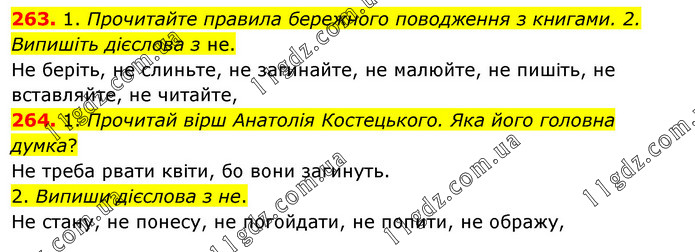 263. 1. Прочитайте правила бережного поводження з книгами. 2. Випишіть дієслова з не. Не беріть, не слиньте, не загинайте, не малюйте, не пишіть, не вставляйте, не читайте, 264. 1. Прочитай вірш Анатолія Костецького. Яка його головна думка? Не треба рвати квіти, бо вони загинуть. 2. Випиши дієслова з не. Не стану, не понесу, не погойдати, не попити, не ображу.