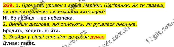 1. Прочитай уривок з вірша Марійки Підгірянки. Як ти гадаєш, чи повірить зайчик лисиччиним хитрощам? Ні, бо лисиця – це небезпека. 2. Випиши дієслова, які описують, як рухалася лисичка. Бродить, ходить, ні йти, 3. Знайди у вірші синоніми до слова думає. Думає: гадає.