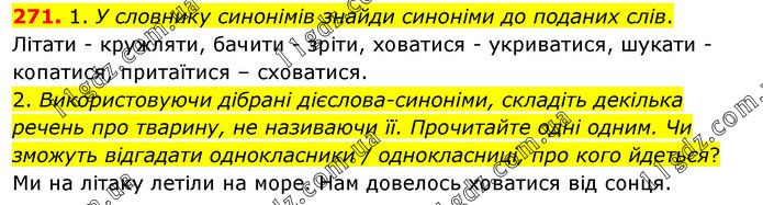 1. У словнику синонімів знайди синоніми до поданих слів. Літати - кружляти, бачити - зріти, ховатися - укриватися, шукати - копатися, притаїтися – сховатися. 2. Використовуючи дібрані дієслова-синоніми, складіть декілька речень про тварину, не називаючи її. Прочитайте одні одним. Чи зможуть відгадати однокласники / однокласниці, про кого йдеться? Ми на літаку летіли на море. Нам довелось ховатися від сонця.