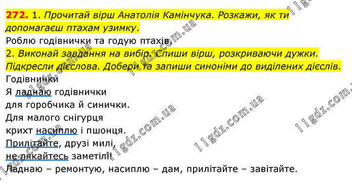 1. Прочитай вірш Анатолія Камінчука. Розкажи, як ти допомагаєш птахам узимку. Роблю годівнички та годую птахів. 2. Виконай завдання на вибір. Спиши вірш, розкриваючи дужки. Підкресли дієслова. Добери та запиши синоніми до виділених дієслів. Годівнички Я ладнаю годівнички для горобчика й синички. Для малого снігурця крихт насиплю і пшонця. Прилітайте, друзі милі, не лякайтесь заметілі! Ладнаю – ремонтую, насиплю – дам, прилітайте – завітайте.