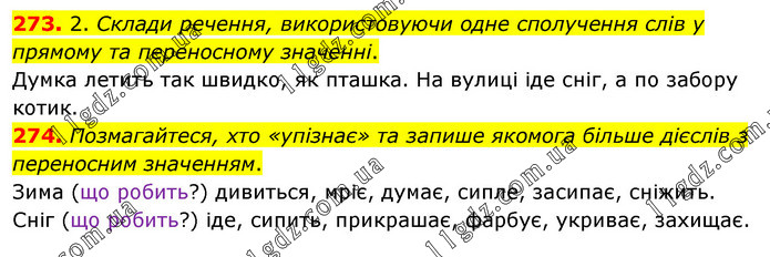 273. 2. Склади речення, використовуючи одне сполучення слів у прямому та переносному значенні. Думка летить так швидко, як пташка. На вулиці іде сніг, а по забору котик. 274. Позмагайтеся, хто «упізнає» та запише якомога більше дієслів з переносним значенням. Зима (що робить?) дивиться, мріє, думає, сипле, засипає, сніжить. Сніг (що робить?) іде, сипить, прикрашає, фарбує, укриває, захищає.