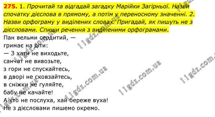 1. Прочитай та відгадай загадку Марійки Загірньої. Назви спочатку дієслова в прямому, а потім у переносному значенні. 2. Назви орфограму у виділених словах. Пригадай, як пишуть не з дієсловами. Спиши речення з виділеними орфограмами. Пан вельми сердитий, — гримає на діти: — З хати не виходьте, санчат не вивозьте, з гори не спускайтесь, в дворі не сковзайтесь, в сніжки не гуляйте, бабу не качайте! А хто не послуха, хай береже вуха! Не з дієсловами пишемо окремо.