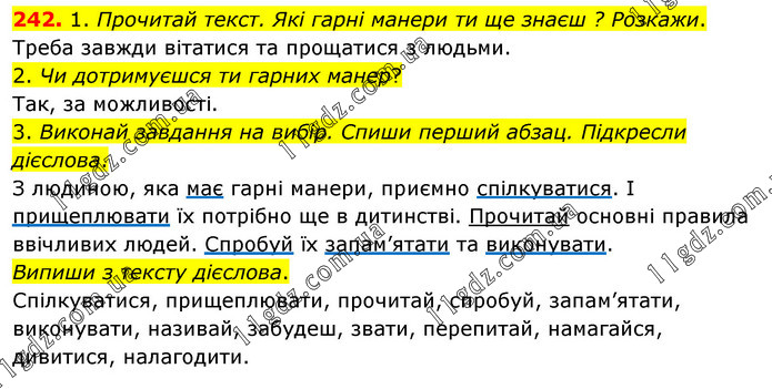 1. Прочитай текст. Які гарні манери ти ще знаєш ? Розкажи. Треба завжди вітатися та прощатися з людьми. 2. Чи дотримуєшся ти гарних манер? Так, за можливості. 3. Виконай завдання на вибір. Спиши перший абзац. Підкресли дієслова. З людиною, яка має гарні манери, приємно спілкуватися. І прищеплювати їх потрібно ще в дитинстві. Прочитай основні правила ввічливих людей. Спробуй їх запам’ятати та виконувати. Випиши з тексту дієслова. Спілкуватися, прищеплювати, прочитай, спробуй, запам’ятати, виконувати, називай, забудеш, звати, перепитай, намагайся, дивитися, налагодити.