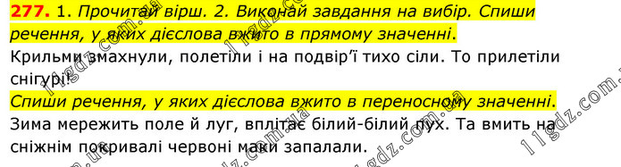 1. Прочитай вірш. 2. Виконай завдання на вибір. Спиши речення, у яких дієслова вжито в прямому значенні. Крильми змахнули, полетіли і на подвір’ї тихо сіли. То прилетіли снігурі! Спиши речення, у яких дієслова вжито в переносному значенні. Зима мережить поле й луг, вплітає білий-білий пух. Та вмить на сніжнім покривалі червоні маки запалали.