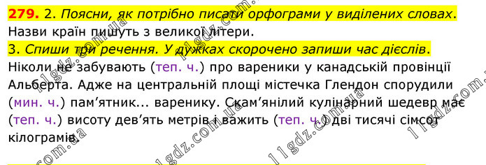 2. Поясни, як потрібно писати орфограми у виділених словах. Назви країн пишуть з великої літери. 3. Спиши три речення. У дужках скорочено запиши час дієслів. Ніколи не забувають (теп. ч.) про вареники у канадській провінції Альберта. Адже на центральній площі містечка Глендон спорудили (мин. ч.) пам’ятник... варенику. Скам’янілий кулінарний шедевр має (теп. ч.) висоту дев’ять метрів і важить (теп. ч.) дві тисячі сімсот кілограмів.