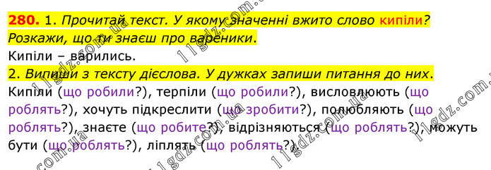 1. Прочитай текст. У якому значенні вжито слово кипіли? Розкажи, що ти знаєш про вареники. Кипіли – варились. 2. Випиши з тексту дієслова. У дужках запиши питання до них. Кипіли (що робили?), терпіли (що робили?), висловлюють (що роблять?), хочуть підкреслити (що зробити?), полюбляють (що роблять?), знаєте (що робите?), відрізняються (що роблять?), можуть бути (що роблять?), ліплять (що роблять?).