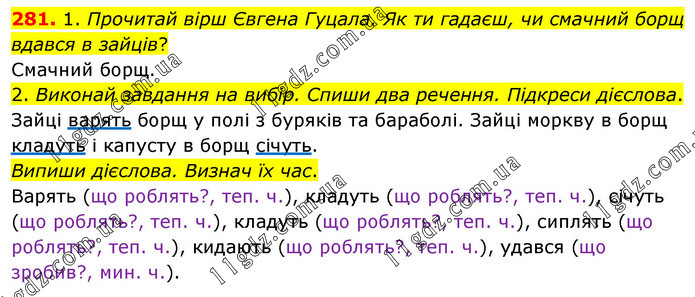 1. Прочитай вірш Євгена Гуцала. Як ти гадаєш, чи смачний борщ вдався в зайців? Смачний борщ. 2. Виконай завдання на вибір. Спиши два речення. Підкреси дієслова. Зайці варять борщ у полі з буряків та бараболі. Зайці моркву в борщ кладуть і капусту в борщ січуть. Випиши дієслова. Визнач їх час. Варять (що роблять?, теп. ч.), кладуть (що роблять?, теп. ч.), січуть (що роблять?, теп. ч.), кладуть (що роблять?, теп. ч.), сиплять (що роблять?, теп. ч.), кидають (що роблять?, теп. ч.), удався (що зробив?, мин. ч.).