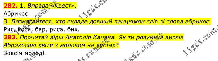 282. 1. Вправа «Квест». Абрикос 3. Позмагайтеся, хто складе довший ланцюжок слів зі слова абрикос. Рис, коса, бар, риса, бик. 283. Прочитай вірш Анатолія Качана. Як ти розумієш вислів Абрикосові квіти з молоком на вустах? Зовсім молоді.