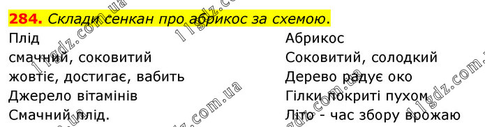 Склади сенкан про абрикос за схемою. Плід смачний, соковитий жовтіє, достигає, вабить Джерело вітамінів Смачний плід. Абрикос Соковитий, солодкий Дерево радує око Гілки покриті пухом Літо - час збору врожаю