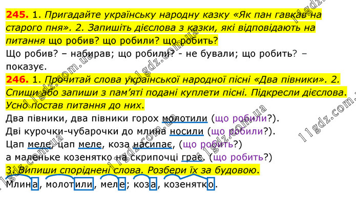 245. 1. Пригадайте українську народну казку «Як пан гавкав на старого пня». 2. Запишіть дієслова з казки, які відповідають на питання що робив? що робили? що робить? Що робив? – набирав; що робили? - не бували; що робить? – показує. 246. 1. Прочитай слова української народної пісні «Два півники». 2. Спиши або запиши з пам’яті подані куплети пісні. Підкресли дієслова. Усно постав питання до них. Два півники, два півники горох молотили (що робили?). Дві курочки-чубарочки до млина носили (що робили?). Цап меле, цап меле, коза насипає, (що робить?) а маленьке козенятко на скрипочці грає. (що робить?) 3. Випиши споріднені слова. Розбери їх за будовою. Млина, молотили, меле; коза, козенятко.