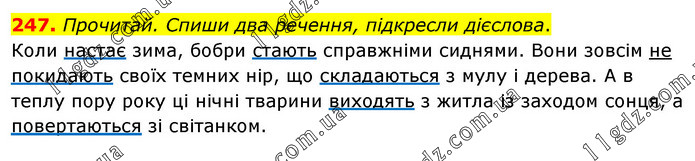 Прочитай. Спиши два речення, підкресли дієслова. Коли настає зима, бобри стають справжніми сиднями. Вони зовсім не покидають своїх темних нір, що складаються з мулу і дерева. А в теплу пору року ці нічні тварини виходять з житла із заходом сонця, а повертаються зі світанком.