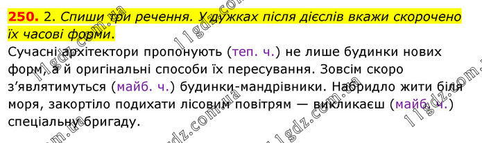 2. Спиши три речення. У дужках після дієслів вкажи скорочено їх часові форми. Сучасні архітектори пропонують (теп. ч.) не лише будинки нових форм, а й оригінальні способи їх пересування. Зовсім скоро з’являтимуться (майб. ч.) будинки-мандрівники. Набридло жити біля моря, закортіло подихати лісовим повітрям — викликаєш (майб. ч.) спеціальну бригаду.