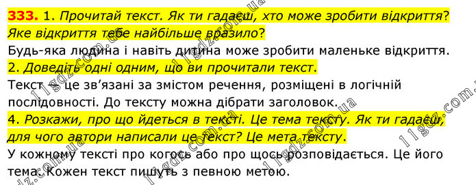 1. Прочитай текст. Як ти гадаєш, хто може зробити відкриття? Яке відкриття тебе найбільше вразило? Будь-яка людина і навіть дитина може зробити маленьке відкриття. 2. Доведіть одні одним, що ви прочитали текст. Текст — це зв’язані за змістом речення, розміщені в логічній послідовності. До тексту можна дібрати заголовок. 4. Розкажи, про що йдеться в тексті. Це тема тексту. Як ти гадаєш, для чого автори написали це текст? Це мета тексту. У кожному тексті про когось або про щось розповідається. Це його тема. Кожен текст пишуть з певною метою.