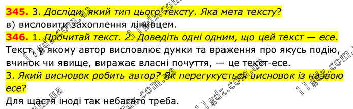 345. 3. Досліди, який тип цього тексту. Яка мета тексту? в) висловити захоплення лінивцем. 346. 1. Прочитай текст. 2. Доведіть одні одним, що цей текст — есе. Текст, у якому автор висловлює думки та враження про якусь подію, вчинок чи явище, виражає власні почуття, — це текст-есе. 3. Який висновок робить автор? Як перегукується висновок із назвою есе? Для щастя іноді так небагато треба.
