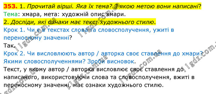 1. Прочитай вірші. Яка їх тема? З якою метою вони написані? Тема: хмара, мета: художній опис хмари. 2. Досліди, які ознаки має текст художнього стилю. Крок 1. Чи є в текстах слова та словосполучення, ужиті в переносному значенні? Так. Крок 2. Чи висловлюють автор / авторка своє ставлення до хмари? Якими словосполученнями? Зроби висновок. Текст, у якому автор / авторка висловлює своє ставлення до написаного, використовуючи слова та словосполучення, вжиті в переносному значенні, має ознаки художнього стилю.