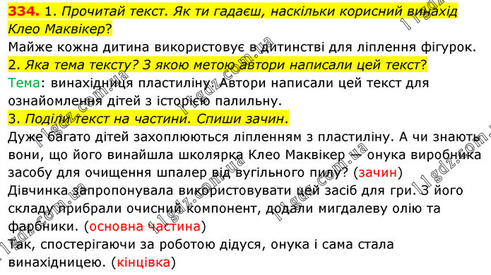 1. Прочитай текст. Як ти гадаєш, наскільки корисний винахід Клео Маквікер? Майже кожна дитина використовує в дитинстві для ліплення фігурок. 2. Яка тема тексту? З якою метою автори написали цей текст? Тема: винахідниця пластиліну. Автори написали цей текст для ознайомлення дітей з історією палильну. 3. Поділи текст на частини. Спиши зачин. Дуже багато дітей захоплюються ліпленням з пластиліну. А чи знають вони, що його винайшла школярка Клео Маквікер — онука виробника засобу для очищення шпалер від вугільного пилу? (зачин) Дівчинка запропонувала використовувати цей засіб для гри. З його складу прибрали очисний компонент, додали мигдалеву олію та фарбники. (основна частина) Так, спостерігаючи за роботою дідуся, онука і сама стала винахідницею. (кінцівка)