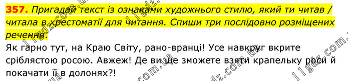 Пригадай текст із ознаками художнього стилю, який ти читав / читала в хрестоматії для читання. Спиши три послідовно розміщених речення. Як гарно тут, на Краю Світу, рано-вранці! Усе навкруг вкрите сріблястою росою. Авжеж! Де ви ще зможете взяти крапельку роси й покачати її в долонях?!