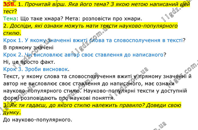 1. Прочитай вірш. Яка його тема? З якою метою написаний цей тест? Тема: Що таке хмара? Мета: розповісти про хмари. 2. Досліди, які ознаки можуть мати тексти науково-популярного стилю. Крок 1. У якому значенні вжиті слова та словосполучення в тексті? В прямому значені Крок 2. Чи висловлює автор своє ставлення до написаного? Ні, це просто факт. Крок 3. Зроби висновок. Текст, у якому слова та словосполучення вжиті у прямому значенні й автор не висловлює своє ставлення до написаного, має ознаки науково-популярного стилю. Науково-популярні тексти у доступній формі розповідають про наукові поняття. 3. Як ти гадаєш, до якого стилю належить правило? Доведи свою думку. До науково-популярного.