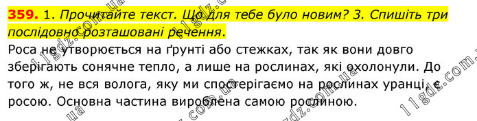 1. Прочитайте текст. Що для тебе було новим? 3. Спишіть три послідовно розташовані речення. Роса не утворюється на ґрунті або стежках, так як вони довго зберігають сонячне тепло, а лише на рослинах, які охолонули. До того ж, не вся волога, яку ми спостерігаємо на рослинах уранці, є росою. Основна частина вироблена самою рослиною.