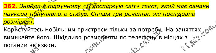 Знайди в підручнику «Я досліджую світ» текст, який має ознаки науково-популярного стилю. Спиши три речення, які послідовно розміщені. Користуйтесь мобільним пристроєм тільки за потреби. На заняттях вимикайте його. Шкідливо розмовляти по телефону в місцях з поганим зв’язком.