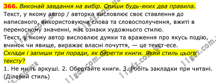 Виконай завдання на вибір. Спиши будь-яких два правила. Текст, у якому автор / авторка висловлює своє ставлення до написаного, використовуючи слова та словосполучення, вжиті в переносному значенні, має ознаки художнього стилю. Текст, у якому автор висловлює думки та враження про якусь подію, вчинок чи явище, виражає власні почуття, — це текст-есе. Склади і запиши три поради, як берегти книги. Який стиль цього тексту? 1. Не мніть аркуші. 2. Обертайте книги. 3. Робіть закладки при читані. (Діловий стиль)