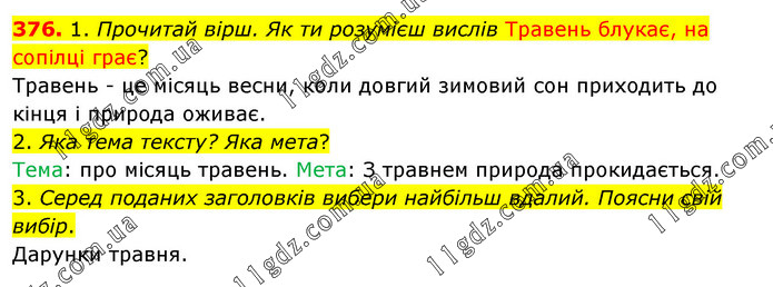 1. Прочитай вірш. Як ти розумієш вислів Травень блукає, на сопілці грає? Травень - це місяць весни, коли довгий зимовий сон приходить до кінця і природа оживає. 2. Яка тема тексту? Яка мета? Тема: про місяць травень. Мета: З травнем природа прокидається. 3. Серед поданих заголовків вибери найбільш вдалий. Поясни свій вибір. Дарунки травня.