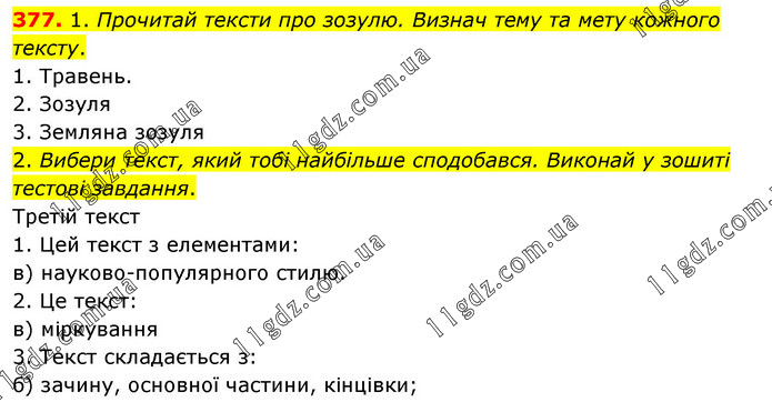 1. Прочитай тексти про зозулю. Визнач тему та мету кожного тексту. 1. Травень. 2. Зозуля 3. Земляна зозуля 2. Вибери текст, який тобі найбільше сподобався. Виконай у зошиті тестові завдання. Третій текст 1. Цей текст з елементами: в) науково-популярного стилю. 2. Це текст: в) міркування 3. Текст складається з: б) зачину, основної частини, кінцівки;