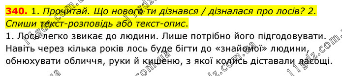 1. Прочитай. Що нового ти дізнався / дізналася про лосів? 2. Спиши текст-розповідь або текст-опис. 1. Лось легко звикає до людини. Лише потрібно його підгодовувати. Навіть через кілька років лось буде бігти до «знайомої» людини, обнюхувати обличчя, руки й кишеню, з якої колись діставали ласощі.
