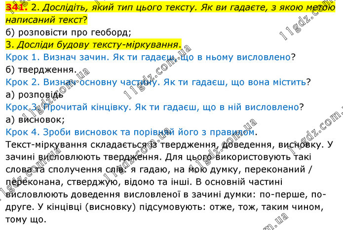 2. Дослідіть, який тип цього тексту. Як ви гадаєте, з якою метою написаний текст? б) розповісти про геоборд; 3. Досліди будову тексту-міркування. Крок 1. Визнач зачин. Як ти гадаєш, що в ньому висловлено? б) твердження. Крок 2. Визнач основну частину. Як ти гадаєш, що вона містить? а) розповідь Крок 3. Прочитай кінцівку. Як ти гадаєш, що в ній висловлено? а) висновок; Крок 4. Зроби висновок та порівняй його з правилом. Текст-міркування складається із твердження, доведення, висновку. У зачині висловлюють твердження. Для цього використовують такі слова та сполучення слів: я гадаю, на мою думку, переконаний / переконана, стверджую, відомо та інші. В основній частині висловлюють доведення висловленої в зачині думки: по-перше, по-друге. У кінцівці (висновку) підсумовують: отже, тож, таким чином, тому що.