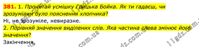 1. Прочитай усмішку Грицька Бойка. Як ти гадаєш, чи зрозумілим було пояснення хлопчика? Ні, не зрозуміле, невиразне. 2. Порівняй значення виділених слів. Яка частина слова змінює його значення? Закінчення.