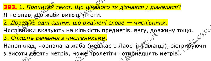 1. Прочитай текст. Що цікавого ти дізнався / дізналася? Я не знав, що жаби вміють літати. 2. Доведіть одні одним, що виділені слова — числівники. Числівники вказують на кількість предметів, вагу, довжину тощо. 3. Спишіть речення з числівниками. Наприклад, чорнолапа жаба (мешкає в Лаосі й Таїланді), зістрибуючи з висоти десять метрів, може пролетіти чотирнадцять метрів.