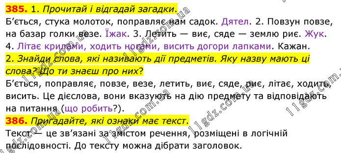 385. 1. Прочитай і відгадай загадки. Б’ється, стука молоток, поправляє нам садок. Дятел. 2. Повзун повзе, на базар голки везе. Їжак. 3. Летить — виє, сяде — землю риє. Жук. 4. Літає крилами, ходить ногами, висить догори лапками. Кажан. 2. Знайди слова, які називають дії предметів. Яку назву мають ці слова? Що ти знаєш про них? Б’ється, поправляє, повзе, везе, летить, виє, сяде, риє, літає, ходить, висить. Це дієслова, вони вказують на дію предмету та відповідають на питання (що робить?). 386. Пригадайте, які ознаки має текст. Текст — це зв’язані за змістом речення, розміщені в логічній послідовності. До тексту можна дібрати заголовок.