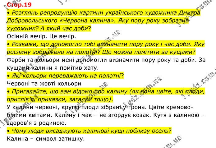 • Розглянь репродукцію картини українського художника Дмитра Добровольського «Червона калина». Яку пору року зобразив художник? А який час доби? Осінній вечір. Це вечір. • Розкажи, що допомогло тобі визначити пору року і час доби. Яку рослину зображено на полотні? Що можна помітити за кущами? Фарби та кольори мені допомогли визначити пору року та доби. За кущами калини я помітив хату. • Які кольори переважають на полотні? Червоні та жовті кольори • Пригадайте, що вам відомо про калину (як вона цвіте, які плоди, прислів’я, приказки, загадки тощо). У калини червоні, круглі плоди зібрані у грона. Цвіте кремово-білими квітами. Калину і мак – не згордує козак. Кутя з калиною – здоров'я з родиною. • Чому люди висаджують калинові кущі поблизу осель? Калина – символ затишку.