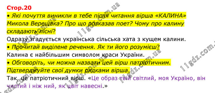 • Які почуття виникли в тебе після читання вірша «КАЛИНА» Микола Верещака? Про що розказав поет? Чому про калину складають пісні? Одразу згадується українська сільська хата з кущем калини. • Прочитай виділене речення. Як ти його розумієш? Калина є найбільшим символом краси України. • Обговоріть, чи можна назвати цей вірш патріотичним. Підтверджуйте свої думки рядками вірша. Так, це патріотичний вірш. «Це образ твій світлий, моя Україно, він чистий і ніж ний, як цвіт навесні.»