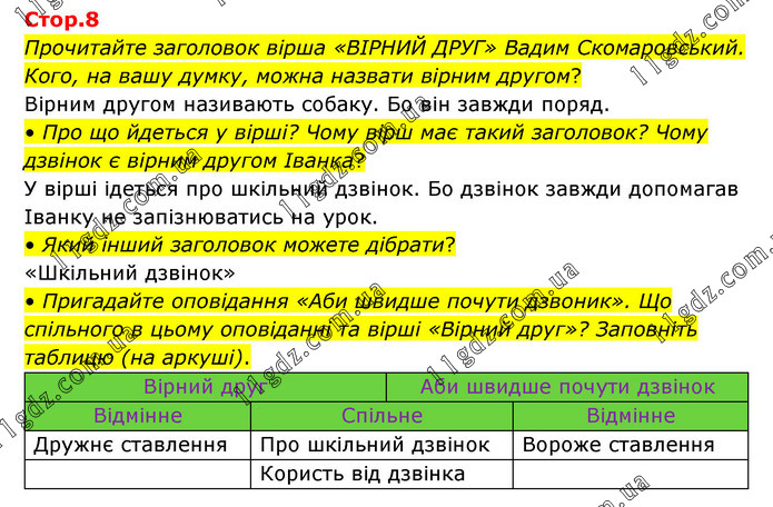 Прочитайте заголовок вірша «ВІРНИЙ ДРУГ» Вадим Скомаровський. Кого, на вашу думку, можна назвати вірним другом? Вірним другом називають собаку. Бо він завжди поряд. • Про що йдеться у вірші? Чому вірш має такий заголовок? Чому дзвінок є вірним другом Іванка? У вірші ідеться про шкільний дзвінок. Бо дзвінок завжди допомагав Іванку не запізнюватись на урок. • Який інший заголовок можете дібрати? «Шкільний дзвінок» • Пригадайте оповідання «Аби швидше почути дзвоник». Що спільного в цьому оповіданні та вірші «Вірний друг»? Заповніть таблицю (на аркуші). Вірний друг Аби швидше почути дзвінок Відмінне Спільне Відмінне Дружнє ставлення Про шкільний дзвінок Вороже ставлення Користь від дзвінка
