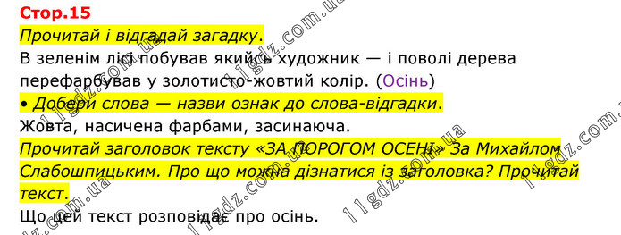 Прочитай і відгадай загадку. В зеленім лісі побував якийсь художник — і поволі дерева перефарбував у золотисто-жовтий колір. (Осінь) • Добери слова — назви ознак до слова-відгадки. Жовта, насичена фарбами, засинаюча. Прочитай заголовок тексту «ЗА ПОРОГОМ ОСЕНІ» За Михайлом Слабошпицьким. Про що можна дізнатися із заголовка? Прочитай текст. Що цей текст розповідає про осінь.