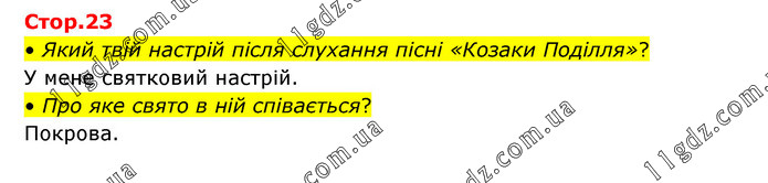 • Який твій настрій після слухання пісні «Козаки Поділля»? У мене святковий настрій. • Про яке свято в ній співається? Покрова.