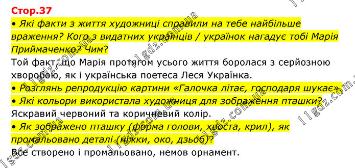 • Які факти з життя художниці справили на тебе найбільше враження? Кого з видатних українців / українок нагадує тобі Марія Приймаченко? Чим? Той факт, що Марія протягом усього життя боролася з серйозною хворобою, як і українська поетеса Леся Українка. • Розглянь репродукцію картини «Галочка літає, господаря шукає». • Які кольори використала художниця для зображення пташки? Яскравий червоний та коричневий колір. • Як зображено пташку (форма голови, хвоста, крил), як промальовано деталі (ніжки, око, дзьоб)? Все створено і промальовано, немов орнамент.